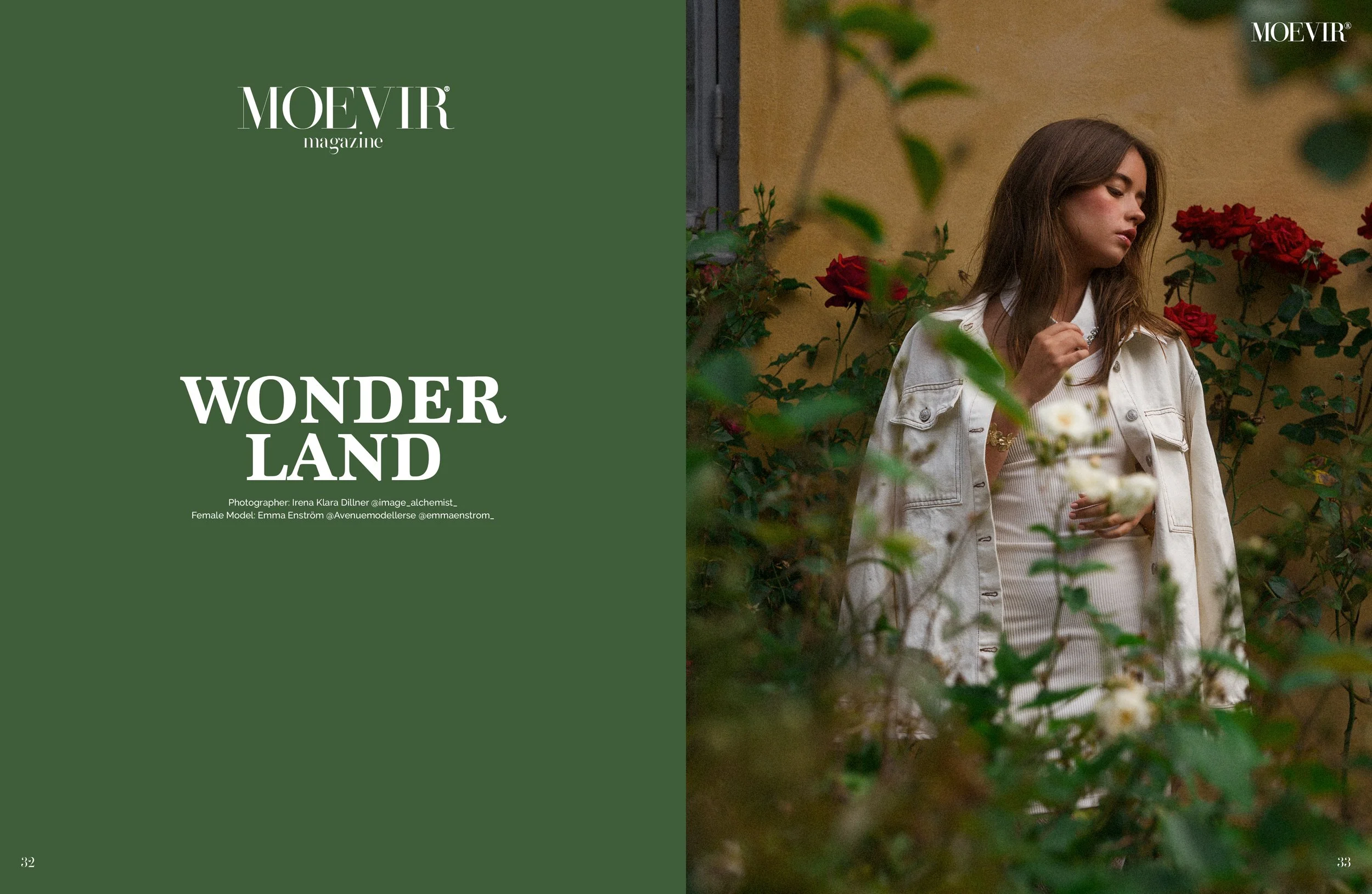 Magazine spread from Moevir Magazine with the title 'Wonderland.' On the right, an image of a woman in a white jacket and dress, surrounded by red and white flowers against a yellow background. The left page is green with text.