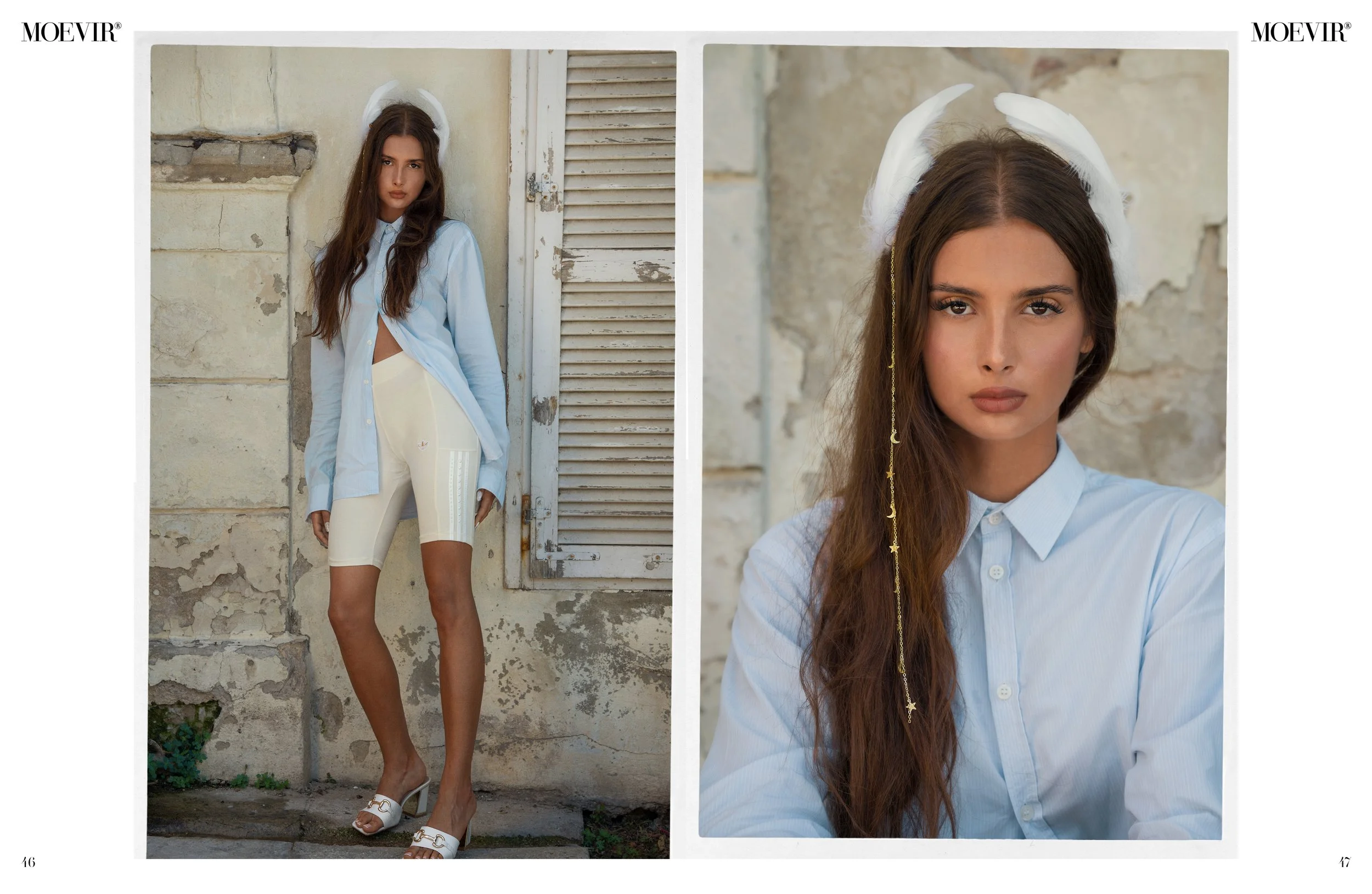 Model wearing a light blue shirt, cream shorts, and white heels, standing against a weathered wall with shutters. She has long hair with a celestial-themed hair accessory featuring feathers and gold stars.