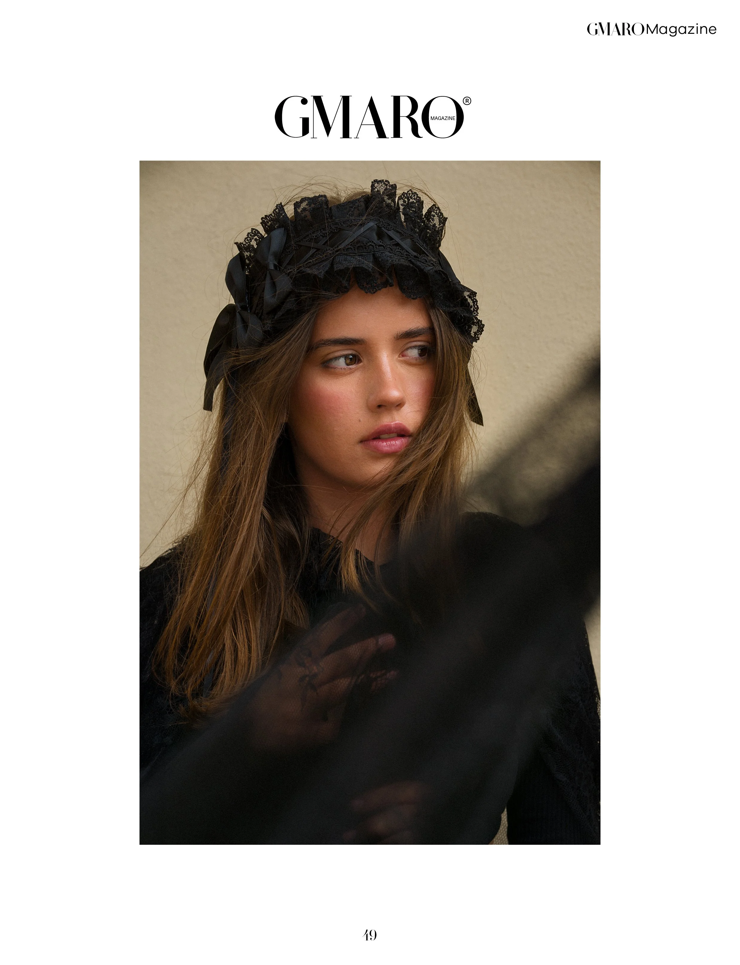 Woman wearing a black lace headpiece and black clothing, featured on a Gmaro magazine cover.