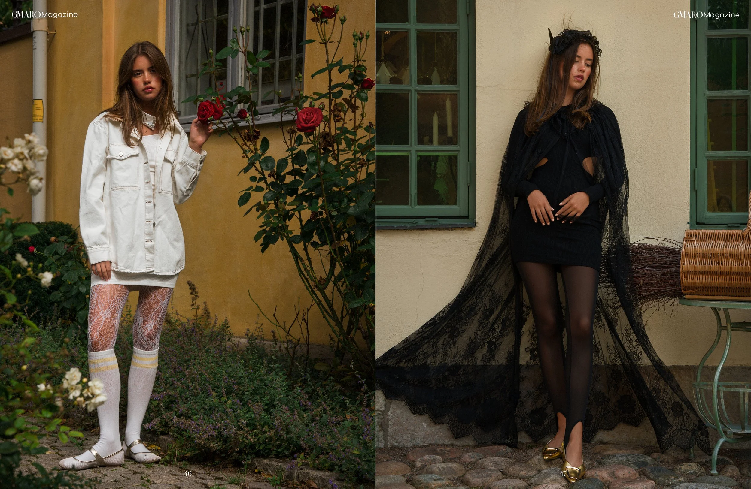 Fashion photoshoot featuring a woman in two outfits: on the left, wearing a white jacket, dress, and floral lace tights standing in a garden; on the right, dressed in a black dress with a lace cape and gold shoes, leaning against a building.