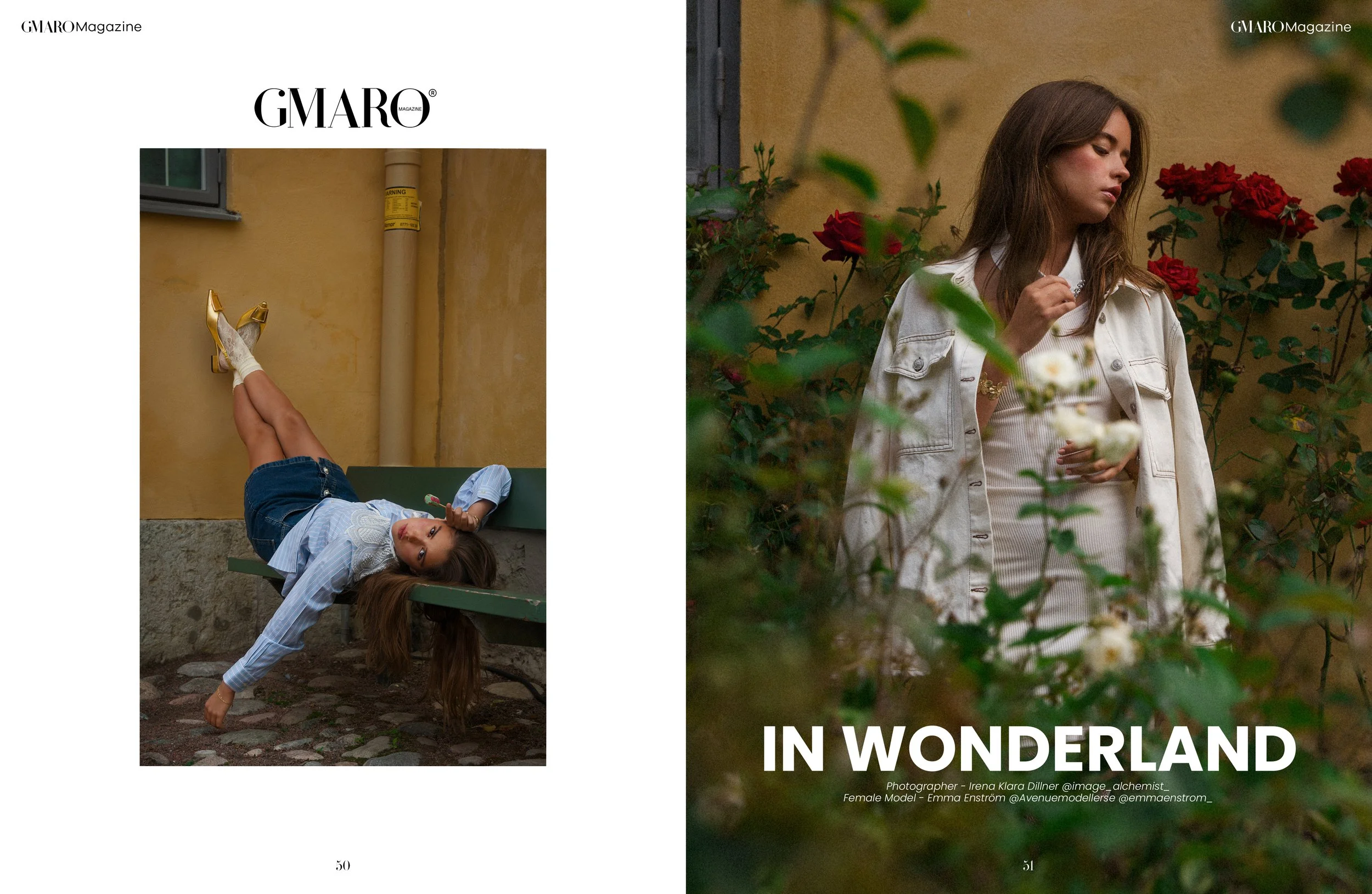Fashion magazine spread from GMARO featuring a woman in a blue blouse and denim skirt lying upside down on a bench, and another image with her in a white jacket and dress standing among red roses. The text "IN WONDERLAND" is displayed.